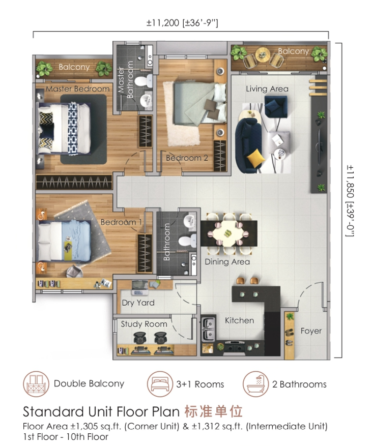 3+1 Bedrooms & 2 Bathrooms + 2 Balcony